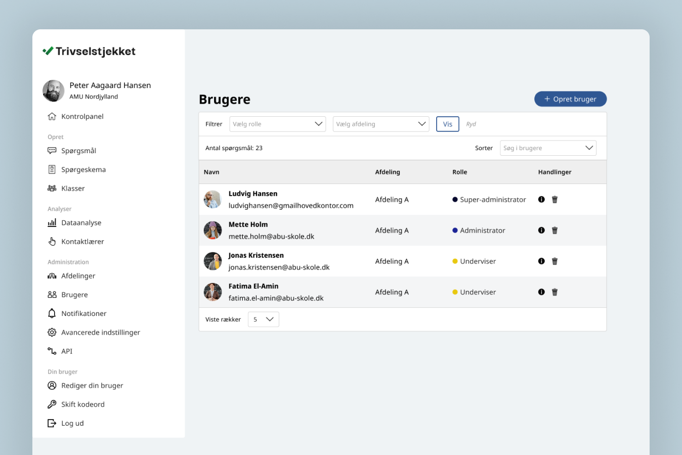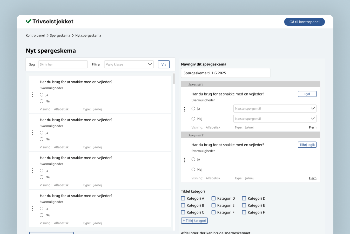 Trivselstjekket er en webapplikation, der kun bruges på desktop af de administrative medarbejdere. Derfor valgte jeg tidligt at prioritere desktop oplevelsen over mobil oplevelsen.