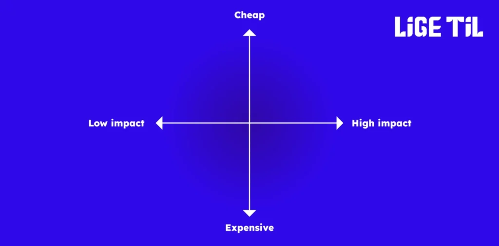 Selvom du har en løsning til hvert optimeringspunkt i CRO analysen, kan det være overvældende at finde ud af, hvor du skal starte og slutte. Her kan det give mening give hvert punkt to tags: Enten Cheap / Expensive og Low Impact / Hight Impact.